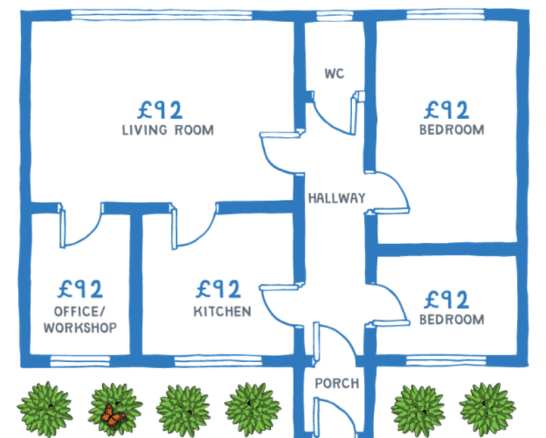 Calculate the percentage of floor space for each room, and divide the total cost by that percentage. For instance, if your bill is for £300 and your office takes 10% of your overall floor space, the room cost would be £30